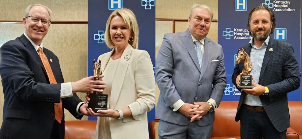 Two additional legislators also received KHA Legislative Champion awards during the event in honor of their commitment to Kentucky health care during the 2025 legislative session. Pictured (left to right) are KHA Senior Vice President of Government Relations and Policy Jim Musser with Representative Amy Neighbors, UK St. Claire CEO and KHA Legislative Committee Chair Don Lloyd, II, and Representative Josh Bray.