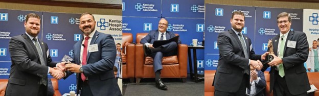 Next, two legislators received awards from KHA before joining Representative Scott Sharp (center) for a House Panel to discuss Medicaid. Pictured far left are KHA Associate Vice President of Government Relations Bryon Ellis presenting the KHA Legislative Hero Award to Representative Wade Williams. Pictured far right is Representative Ken Fleming receiving the KHA Legislative Champion Award.